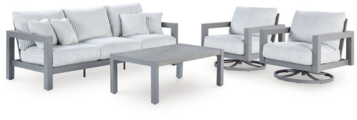 Indulge in luxe outside living without sacrificing longevity. This outdoor package combines on-trend texture with sleek aluminum frames. Lounge poolside or on the porch—the comfy cushions are a chic spot to soak up the sun. And with cleanable, UV-resistant Nuvella® fabric in a showstopping corded look, style and durability go hand in hand.