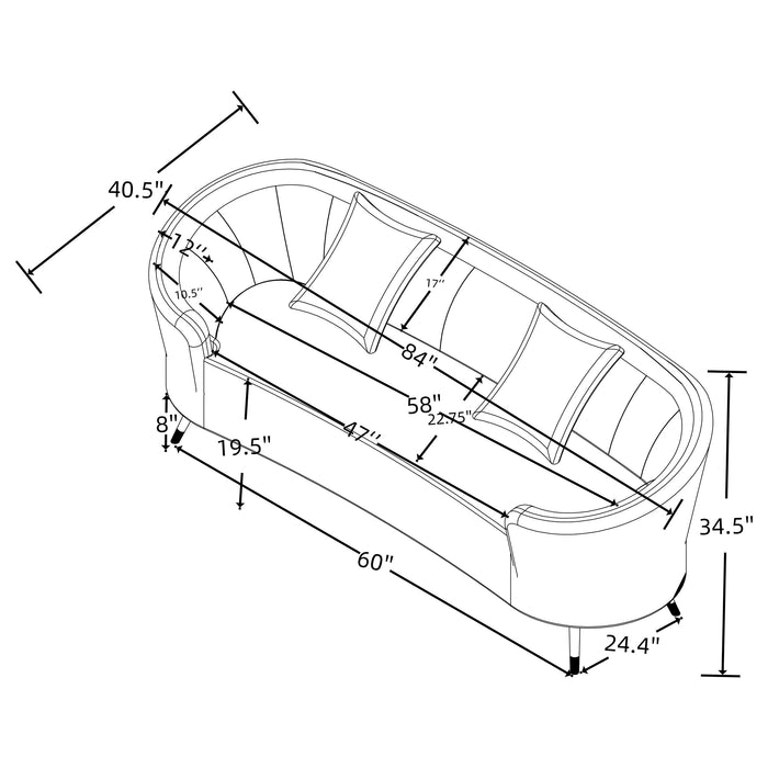 The gentle curvature of a kidney silhouette brings graceful energy to this two-piece modern sofa set. A smooth bench seat is complemented with a channel tufted back in both the sofa and loveseat, creating stylish ambiance and comfortable seating. Soft beige upholstery fabric sets the tone, while accent pillows add flexible comfort and inviting ambiance. The set shows off a tailored profile, complete with a shelter back and sloping arms. Each piece stands on slender, tapered legs in a black finish, offering a touch of contrast and depth in your living room. Key Features: • Soft beige upholstery creates a bright, inviting ambiance for a modern sofa and loveseat set • Curved kidney silhouette features widely spaced channel tufting for texture and depth • Fully encased solid and engineered wood frame provides lasting durability and reliability • Features attached cushions with accent pillows included for added comfort and flexibility • Seats feature pocket coils and sinuous springs, creating durability and comfort in your home
