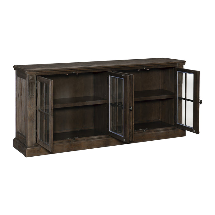 With styling that hints at times gone past, the Gloversville Collection’s stately presence will be the perfect addition to your dining room. Allowing for storage space within your dining room is the available server, its pine veneer wood-framed glass-fronted doors are secured with cremone-style bolts, their vintage look providing classic accent to the piece. The pine veneer and pine solids of the server feature a brown finish that furthers the classic look of the collection.