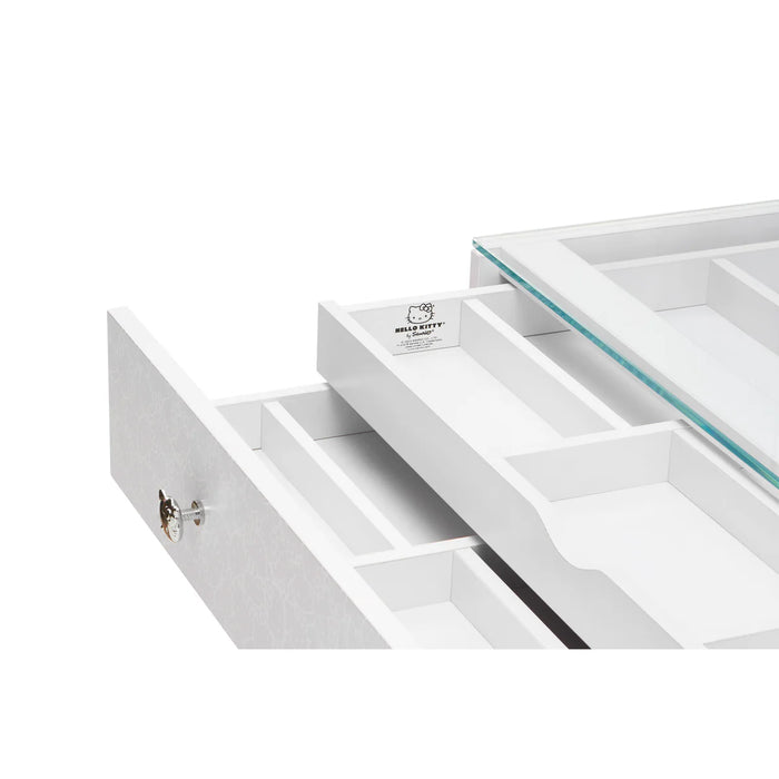 The Hello Kitty® SlayStation Mini Vanity Table features two levels of built-in preset compartments. The top level showcases all your beautiful glam essentials while the bottom level perfectly hides items you don't want to be displayed. The drawer is also adorned in Hello Kitty signature silhouette that gleams with our supercute Hello Kitty decorative knobs. MDF Material